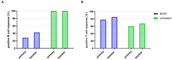 SARS-CoV-2-specific B-cell and T-cell responses in patients before versus on BCDT at primary vaccination.