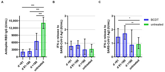 B- and T-cellular responses to primary vaccination in anti-CD20-depleted versus untreated patients (n = 348). B- and T-cell responses in patients with B-cell-depleting therapy (BCDT) (blue, n = 271) and untreated (green, n = 77) patients to the primary vaccination are presented. BCDT is further differentiated regarding timepoint of last BCDT treatment cycle and vaccination: <91 days (n = 95), between 91 and 180 days (n = 165) and >180 days (n = 11) before vaccination. (A) presents the B-cell response, (B) the T-cell response to Ag1, and (C) the T-cell response to Ag2. Means with 95%CI are presented. The dashed line shows the cut-off for a positive T-cell response, defined at 0.015 IU/mL. For the B-cell response, the cut-off level is defined at 0.08 U/mL. Data were analyzed with generalized linear models with gamma distribution and log link function. Sex, age, Expanded Disability Status Scale, time between vaccination and blood sampling, confirmed previous COVID-19 infection, and treatment group served as fixed factors. For pairwise comparisons, contrast tests with Sidak correction were applied. Asterisks indicate level of statistical significance: * p < 0.05, ** p < 0.01, *** p < 0.001. (A): p < 0.001 for untreated compared to d > 180, p < 0.001 for untreated compared to d 91–180, p < 0.001 for untreated compared to d < 91, p = 0.008 for d > 180 compared to d < 91, p = 0.013 d > 180 compared to d 91–180.