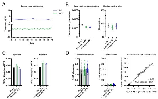 SARS-CoV-2 VLPs are stable at 4° and −80 °C in solution for at least 10 weeks. (A) Storage temperature monitored by a data logger. The quality of VLPs was assessed after 10 weeks by (B) NTA, (C) spike- and nucleoprotein ELISA and (D) by the reactivity of the VLPs with human convalescent (n = 16) and control serum (n = 16).