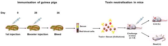 Schematic representation of immunisation of guinea pigs and toxin neutralization assay in mice. BoNT C and BoNT D were formulated as a bivalent vaccine as well as a multivalent vaccine with two additional antigens. The vaccine was administered subcutaneously on day 0 (1st injection) and day 28 (booster injection). On day 35, the guinea pigs were bled, and the blood samples were centrifuged to obtain sera, which was evaluated in a toxin neutralisation assay. Live mice indicate neutralisation of the toxin and death indicates the absence of toxin neutralisation.