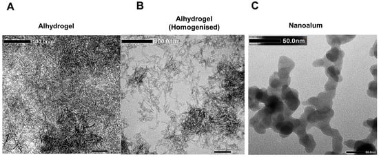Characterization of alhydrogel and nanoalum particle morphology via transmission electron microscopy. (A) Untreated alhydrogel particles. (B) Alhydrogel after homogenization at 10,000 rpm. (C) PAA-stabilized nanoalum. The scale bar was 100 nm for alhydrogel and 50 nm for nanoalum.