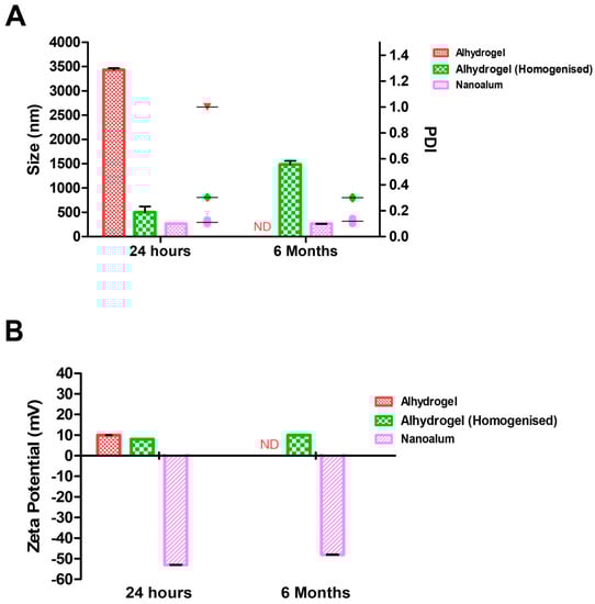 Physiochemical characterization of alhydrogel and nanoalum. (A) Particle sizes and polydispersity index (PDI), and (B) zeta potential analysis via dynamic light scattering on a zetasizer. (C) Viscosity and conductivity measured using a viscometer. ND: not determined.