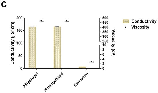 The morphology of the adjuvants was analysed under a transmission electron microscope (Figure 2). The alhydrogel displayed filamentous particles which formed aggregates that were dispersed via homogenization (Figure 2A,B). The addition of PAA prior to homogenisation resulted in the formation of nanoalum, which displayed plate-like particles (Figure 2C). The properties and particle sizes of the adjuvants were analysed using dynamic light scattering (DLS). The untreated alhydrogel was 3400 nm with a PDI of 1.0 (Figure 3A) and a ζ potential of +10 mV (Figure 3B). Following homogenisation, the alhydrogel particle size was reduced to an average of 620 nm (Figure 3A) and the nanoalum had an average diameter of 265 nm, and the addition of PAA shifted the ζ-potential to −53 mV (Figure 3B). The viscosity of the alhydrogel was 471 cP with a conductivity of 164.1 µS/cm, and these were reduced to 2.94 cP (water-like consistency) and 5.60 µS, respectively, in the nanoalum samples (Figure 3C). Furthermore, the nanoalum particles maintained a stable size conformation over six months of storage at 4 °C, whereas the alhydrogel reaggregated to 1555 nm (Figure 3A). The untreated alhydrogel particles’ sizes could not be determined via DLS after 6 months.