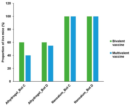 The potency of the alhydrogel formulation was compared with that of the nanoalum formulation. The botulism bivalent vaccine contained BoNT C and D antigens. The multivalent vaccine contained BoNT C and BoNT D antigens, and two other bacterial antigens. The overall protective efficacy of the alhydrogel- and nanoalum-containing vaccines was informed by the total number of mice that survived in the toxin neutralization assay. In the bivalent formulations, the nanoalum vaccine demonstrated 100% protection against a challenge with BoNT toxins, while the maximum protection achieved with the alhydrogel vaccine was only 60% against the BoNT C and BoNT D challenge (Figure 5). In the multivalent vaccine study, the alhydrogel-containing vaccine achieved 40% and 55% protection against the BoNT C and BoNT D challenge, respectively, while 100% of the mice survived in the nanoalum vaccine group.