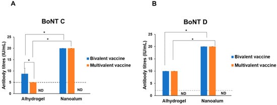 Neutralizing antibody titres against BoNT C and D toxins induced by alhydrogel- and nanoalum-adjuvanted vaccines. The guinea pigs were immunized with a Botulinum type C and D bivalent vaccine; seven days after booster immunization, the guinea pigs were bled, and the neutralizing antibodies obtained from the sera were quantified in a toxin neutralization assay. (A) Anti-BoNT C titres. (B) Anti-BoNT D titres. The dotted lines represent the minimum required titres. Bivalent vaccine: containing BoNT C and BoNT D; Multivalent vaccine: BoNT C, BoNT C, and two other bacterial antigens ND: not detected. * p < 0.0001.