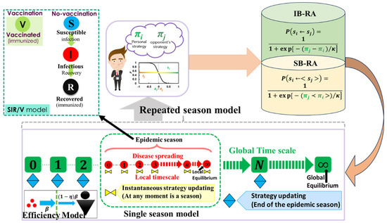 Schematic diagram of the model in which the population is divided into four states: susceptible , vaccinated , infected , and recovered , which applies in the epidemic season on a local time scale. On the other hand, the evolutionary decision-making process based on the Fermi pairwise game occurs globally. An individual chooses whether to vaccinate at the onset of each epidemic season based on two updated dynamics: IB-RA (individual-based risk assessment) and SB-RA (society-based risk assessment). The vaccine efficiency (VE) models determine the fraction of vaccinated and corresponding immunity systems.