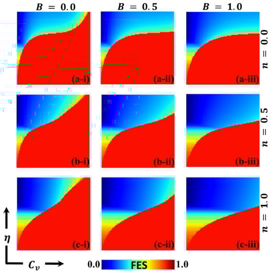 The 2D heatmap of the final epidemic size (FES) is presented by varying two parameters: the -axis contains the vaccination cost (), and the -axis shows the vaccination efficacy . In this figure, the first, second, and third rows display the result of varying the selection intensity rate (a-*) n = 0.0, (b-*) n = 0.5, and (c-*) n = 1.0. Also, the first, second, and third columns show the result of varying the benefit rate: (*-i) , (*-ii) , and (*-iii) . Other parameters are , [13,14].