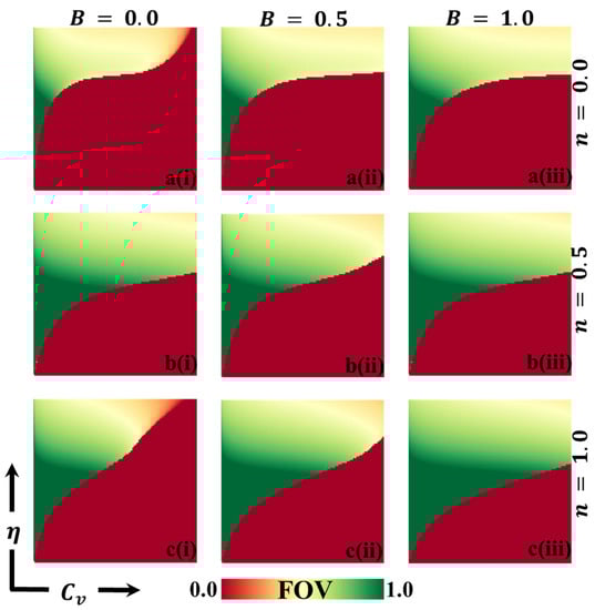 The 2D heatmap representing the fraction of vaccination (FOV) illustrates variations in two parameters: the -axis represents the vaccination cost (), while the -axis represents vaccination efficacy (). In this figure, we present results for different combinations of selection intensity rates—specifically, (a-*) in the first row, (b-*) in the second row, and (c-*) in the third row. Additionally, the first, second, and third columns depict results for different benefit rates: (*-i) , (*-ii) , and (*-iii) . It is important to note that we have kept other parameters constant, with and [13,14].
