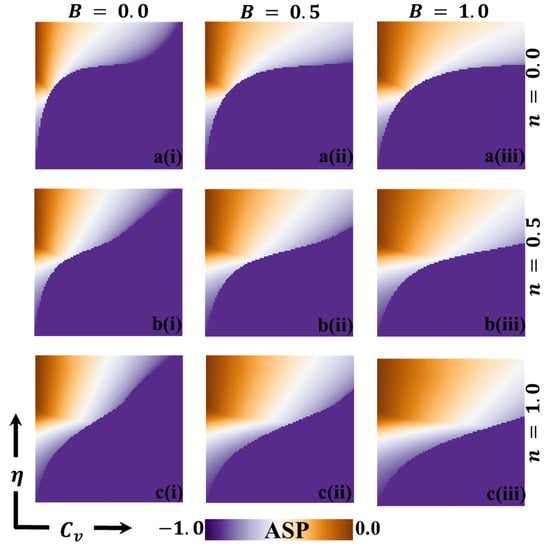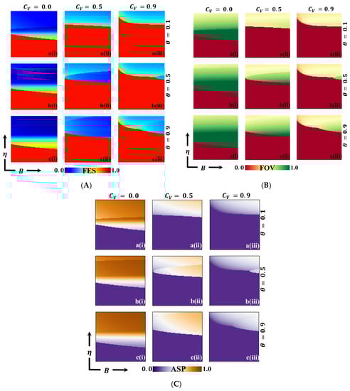 Figure 3 illustrates the results obtained by assuming different information benefit rates () concerning a fraction of vaccinators (FOV). The depicted scenarios correspond to B values of 0.0, 0.5, and 1.0. Additionally, three types of strategy-updating aspects are shown: (a-*) IB-RA, (b-*) intermediate, and (c-*) SB-RA. These aspects are associated with varying vaccination costs and efficiencies. In the controlled epidemic phase, we can observe a green-colored region in the diagrams, indicating a high vaccination coverage. A combination of higher efficiency and lower vaccination prices characterizes this region. It is interesting to note that even when a significant portion of the population receives the vaccination, the epidemic cannot be eliminated due to the lower reliability of the vaccine. Figure 4 likely provides additional information about the average social payoff (ASP). Although they are different from Figure 4, the detailed full-phase diagrams follow a similar overall trend. Overall, the findings from Figure 3 and Figure 4 suggest that the information benefit rates (), along with the selection of strategy updating aspects and associated vaccination costs and efficiencies, play crucial roles in shaping the outcomes of the epidemic control efforts. Higher values and effective strategies can increase vaccination coverage and mitigate the epidemic’s impact. However, despite high vaccination rates, the reliability of the vaccine remains a critical factor in determining the success of epidemic elimination.