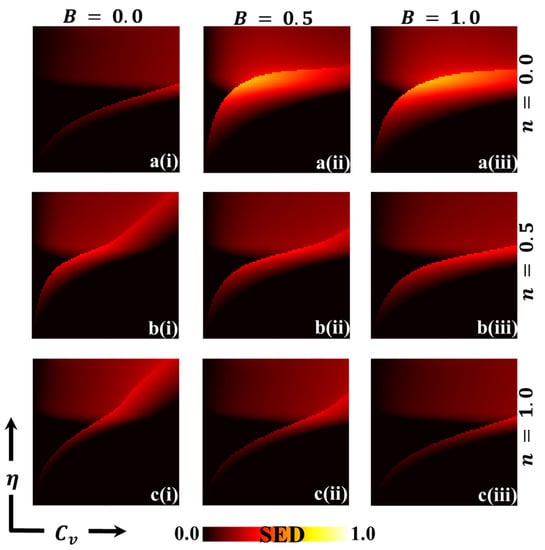 The 2D heatmap depicting the social efficiency deficit (SED) is generated by manipulating two key parameters: the -axis represents the vaccination cost (), while the -axis signifies vaccination efficacy (). Within this graphical representation, the results are organized into three rows, each presenting variation in the selection intensity rate : the first row corresponds to (a-*) , the second to (b-*) , and the third to (c-*) . Similarly, the results are arranged into three columns, each reflecting change in the benefit rate: (*-i) in the first column, (*-ii) in the second column, and (*-iii) in the third column. We must note that we have maintained the constancy of other parameters throughout, with and [13,14].