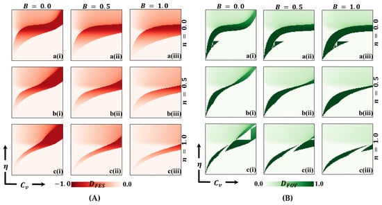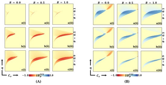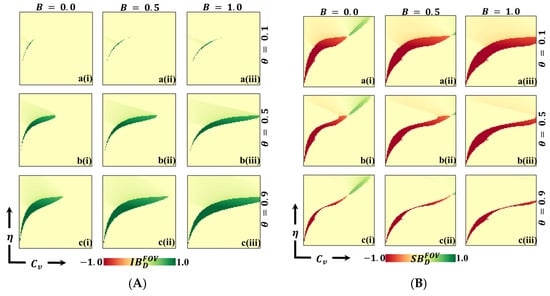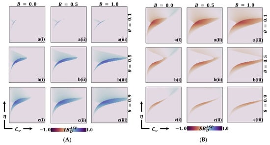 Figure 7, Figure 8 and Figure 9 depict 2D graphs illustrating the relationship between and for two scenarios: (Panel A) deviation from Individual-Based Risk Assessment (IB-RA), denoted as , and (Panel B) deviation from Society-Based Risk Assessment (SB-RA), denoted as . These figures provide insights into decision-making outcomes and the effects of changing strategies. To calculate the FES, FOV, and ASP for and , we systematically consider every combination of and and determine IB-RA () and SB-RA () values. In doing so, we evaluate the baseline outcomes for these two decision-making approaches. Subsequently, we estimate the FES, FOV, and ASP for the dynamic equation of (as defined in Equation (8)). This allows us to examine decision-making outcomes for different values of theta and assess the influence of dynamic decision-making on these measures. Finally, we calculate the values of and by comparing the FES, FOV, and ASP values obtained for the constant values of with those obtained for the dynamic of . These calculated values highlight how decisions change from myopic or individual-based associations to more community-based associations . These calculations demonstrate the impact of different decision-making approaches on FES, FOV, and ASP, shedding light on how myopic or community-based decision-making strategies influence individual choices and outcomes.