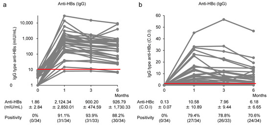 Induction of IgG-type anti-HBs and anti-HBc production by CVP-NASVAC. The titers of IgG-type (a) anti-HBs and (b) anti-HBc for each HB vaccine non-responder are plotted on the y-axis. Each gray line represents the titer of an individual. The red line represents the cut-off value for anti-HBs (10 mIU/mL) and anti-HBc positivity (1.0 C.O.I.). The titers are shown as mean ± standard deviation. CVP-NASVAC, an intranasal vaccine containing both hepatitis B surface and core antigens mixed with carboxyl vinyl polymer; anti-HBs, the antibody against hepatitis B surface antigen; anti-HBc, the antibody against hepatitis B core antigen; C.O.I., cut-off value.