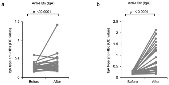 Induction of IgA-type anti-HBs and anti-HBc production by CVP-NASVAC. The OD values of IgG-type (a) anti-HBs and (b) anti-HBc for each HB vaccine non-responder are plotted on the y-axis. Each gray line represents the titer value of an individual. The p-values were calculated using the Wilcoxon signed-rank test. p < 0.05, compared before and after vaccination. CVP-NASVAC is an intranasal vaccine containing both hepatitis B surface and core antigens mixed with carboxyl vinyl polymer; anti-HBs, the antibody against hepatitis B surface antigen; anti-HBc, the antibody against hepatitis B core antigen.