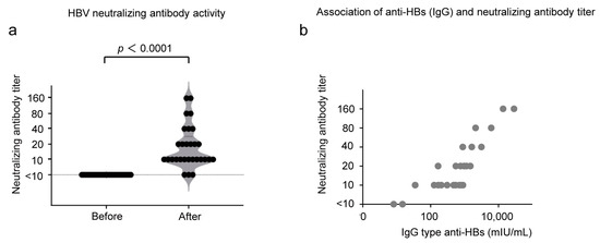 To evaluate the HBV-neutralizing activity of the antibody induced by CVP-NASVAC, we conducted an in vitro HBV-neutralization test. The sera from five participants were not stored properly; thus, the sera from the remaining 29 participants were analyzed. Although none of the HB vaccine non-responders showed HBV neutralization before CVP-NASVAC administration, 26/29 (89.6%) participants showed HBV-neutralizing activity after CVP-NASVAC administration (Figure 4a). The neutralizing activity was significantly correlated with the titer of IgG-type anti-HBs (Figure 4b). These results indicate that CVP-NASVAC induced anti-HBs production in HB vaccine non-responders, neutralizing HBV particles.