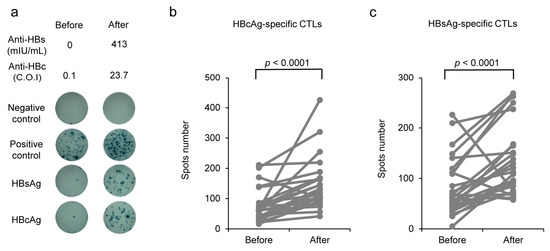 HBV-specific CTLs were detected using commercial enzyme-linked immunosorbent spot (ELISPOT) assay kits (Human IFN-γ ELISpot PLUS; MABTECH, Stockholm, Sweden). Briefly, 2 × 105 peripheral blood mononuclear cells (PBMCs) from non-responders were harvested in 96-well plates containing Roswell Park Memorial Institute 1640 medium supplemented with 10% (v/v) FCS, 100 U/mL penicillin G, and 100 µg/mL streptomycin. The cells were further stimulated with either HBsAg (genotype C) or HBcAg (Beacle, Inc.) or anti-CD3 monoclonal antibodies as the positive control. After 72 h of incubation at 37 °C under 5% CO2, 0.1 µg/well of the detection antibody was added to the samples; then, the plates were incubated for another 2 h at 22 °C. Subsequently, streptavidin horseradish peroxidase was added to the samples and incubated at 22 °C for 1 h. Finally, 100 μL/well of 3,3′,5,5′-Tetramethylbenzidine substrate solution was added to the samples, and the plates were incubated for another 5–10 min at 22 °C. The plates were washed with PBS, and spots were analyzed using the AID ELISPOT Reader 08 classic (Advanced Imaging Devices GmbH, Straßberg, Germany).