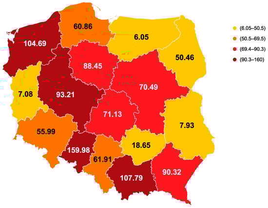 The number of hospitalizations due to RSV infections (ICD-10 codes J12.1, J20.5, and J21) in relation to the size of the pediatric population differed considerably between voivodeships in Poland, with values ranging from 6.05 to 159.98 per 100,000 (Figure 1) [23].