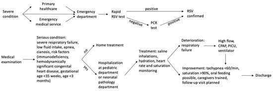 Currently, there is no effective treatment for RSV-related infections, and the management is only supportive [38]. According to recommendations, antibiotics, bronchodilators, and corticosteroids should not be routinely applied. Corticosteroids can be considered in patients with significant airway obstruction, and β2-agonists may be used in individual cases. Inhaled hypertonic saline can be applied in selected hospitalized patients. Oxygen therapy is recommended if the oxygen saturation is lower than 90% [39], although recent studies clearly show that high-flow nasal cannula (HFNC) therapy is more effective than passive oxygen therapy [40,41,42]. The results of chest X-ray imaging do not correlate with disease severity. The use of chest radiography leads to increased use of antibiotics, so it should be limited to patients suspected of serious respiratory complications or considered for intensive care unit admission [39,43].