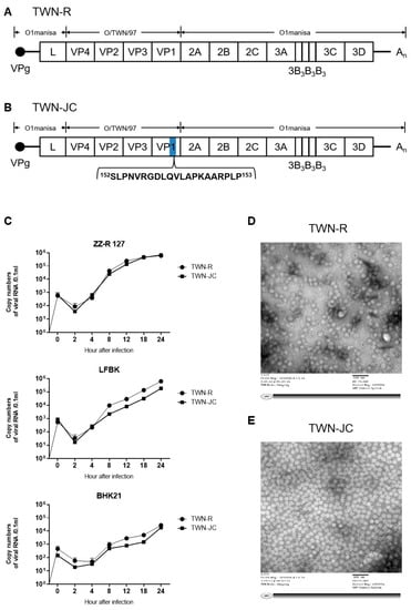 Characteristics of the TWN-R and TWN-JC. Schematic diagram of the TWN-R and TWN-JC genomes (A,B). TWN-JC is a novel vaccine candidate that has a JC epitope inserted into the TWN-R strain. TWN-R, which has the TWN P1 genome and O1manisa backbone, and TWN-JC, which has the VP1 140–160 linear B-cell epitope of the JC strain inserted into the VP1 GH loop region of TWN-R. Comparison of viral replication between TWN-R and TWN-JC in vitro. Three types of cells (ZZ-R 127, LFBK, and BHK-21) were infected at multiplicity of infection (MOI) of 0.01, and virus growth was measured at 0, 2, 4, 8, 12, 18, and 24 h post-infection (C). Transmission electron microscope (TEM) imaging of TWN-R (D) and TWN-JC (E).