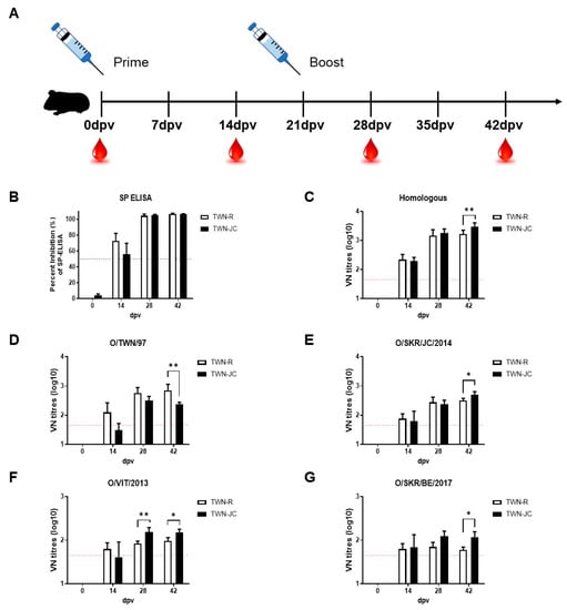 Immunogenicity of the recombinant virus in guinea pigs. Guinea pigs (n = 5) were vaccinated with 7.5 µg of inactivated antigen mixed with ISA 206, aluminum hydroxide gel adjuvant, and saponin. Sera were collected at 0, 14, 28, and 42 dpv, and the animals were boosted at 21 dpv. Schematic diagram of the experimental strategy (A), Structure Protein (SP) ELISA results generated using serum from guinea pigs vaccinated with TWN-R or TWN-JC (B), and the homologous (C) and heterologous neutralizing antibody titers against TWN (D), JC (E), VIT (F), and BE (G) in guinea pigs vaccinated with TWN-R or TWN-JC. A percent inhibition (PI) value > 50 was considered the cutoff for a positive reaction (blue dotted line). VN titers (log10) > 1.65 were regarded as positive (red dotted line). p values of p < 0.05 (*) and p < 0.01 (**).