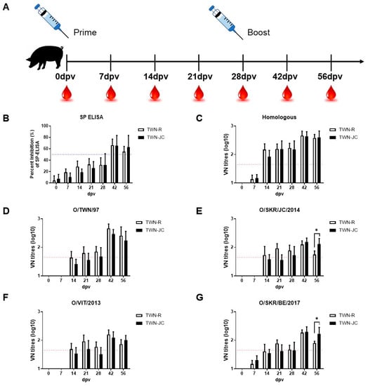 Immunogenicity of the recombinant virus in pigs. Pigs (n = 5) were vaccinated with 15 µg of inactivated antigen mixed with ISA 206, aluminum hydroxide gel adjuvant, and saponin. Sera were collected at 0, 7, 14, 21, 28, 42, and 56 dpv, and the animals were boosted at 28 dpv. Schematic diagram of the experimental strategy (A), Structure protein (SP) ELISA results generated using serum from pigs vaccinated with TWN-R or TWN-JC (B), and the homologous (C) and heterologous neutralizing antibody titers against TWN (D), JC (E), VIT (F), and BE (G) in pigs vaccinated with TWN-R or TWN-JC. A PI value > 50 was considered the cutoff for a positive reaction (blue dotted line). VN titers (log10) > 1.65 were regarded as positive (red dotted line). p values of p < 0.05 (*).