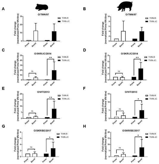 Comparison of specific serological changes associated with the different topotypes in guinea pigs (n = 5) and pigs (n = 5). The fold change associated with the different topotypes were compared using the prime (14 dpv) and boost (42 dpv) serum samples obtained from the guinea pigs (A,C,E,G) and the prime (28 dpv) and boost (56 dpv) serum samples obtained from the pigs (B,D,F,H). The fold change of the boost VN titer was normalized to prime VN titer. p values of p < 0.05 (*) and p < 0.01 (**).