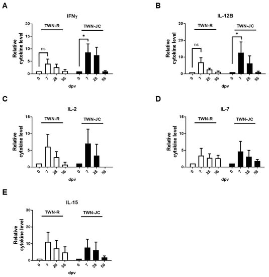 Cytokine secretion in pigs (n = 5) vaccinated with TWN-R or TWN-JC. The serum levels of IFNγ (A), IL-12B (B), IL-2 (C), IL-7 (D), and IL-15 (E) were detected post-vaccination using an ELISA. The 7, 28, and 56 dpv serum samples obtained from pigs immunized with TWN-R or TWN-JC were tested and normalized to serum before vaccination. p values of p < 0.05 (*).