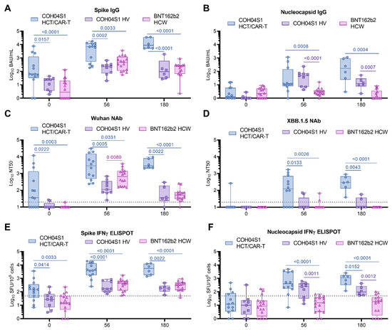 Immunogenicity of COH04S1 in HCT/CAR-T patients and COH04S1 or Comirnaty® in healthy adults. SARS-CoV-2 binding antibodies (IgG) to SARS-CoV-2 spike (S, (A)), nucleocapsid (N, (B)), neutralizing antibody titers to SARS-CoV-2 Wuhan-Hu-1 ancestral strain (C), and XBB.1.5 variant (D), and IFNγ T cells specific for SARS-CoV-2 S (E) and N (F) were measured in samples of COH04S1-vaccinated HCT/CAR-T patients (circles) at baseline (n = 13), day 56 (n = 12), and 180 (n = 6) post vaccination, and compared to responses measured in healthy volunteers (HV, squares, d0-d56 n = 9, d180 n = 6) vaccinated with COH04S1 or healthcare workers (HCW, triangles, n = 17) vaccinated with the FDA-approved mRNA vaccine Comirnaty® at the same timepoints. Dotted lines in (C,D) represent the lower limit of detection. Dotted lines in (E,F) represent the arbitrary threshold of positivity (50 spots/106 cells). At the day 180 timepoint, 4/6 HCT/CAR-T patients had received three/four COH04S1 doses. Data are presented as box plots extending from 25th to 75th percentile, with lines indicating medians, and whiskers going from minimum to maximum values. Values were compared using the two-tailed Mann–Whitney test. p values ≤ 0.05 are indicated. Where not indicated, p > 0.05.