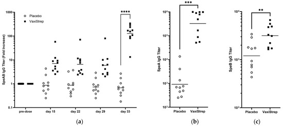 Immunogenicity of VaxiStrep in New Zealand White rabbits and individual SpeA and SpeB titers. A total of 10 rabbits (5 male and 5 female) received either placebo or VaxiStrep on day 1 and day 29. (a) Blood samples were collected on days—1 (pre-dose), 15, 22, 29, and 33, and individual serum IgG SpeAB titers were determined. The SpeAB serum titers are presented as a fold increase over pre-dose for days 15, 22, 29, and 33; unpaired t-test p-values between placebo and VaxiStrep groups were 0.0665, 0.1059, 0.1343, and <0.0001, respectively. (b) Individual day 33 serum IgG SpeA titers. (c) Individual day 33 serum IgG SpeB titers. Unpaired t-test values were 0.0007 and 0.0053 for SpeA and SpeB, respectively, between Placebo and VaxiStrep. The geometric mean is shown by a horizontal line. (**: p < 0.01, ***: p < 0.001, ****: p ≤ 0.0001).