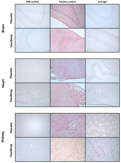 Immunohistochemistry staining for IgG in rabbit brain, heart, and kidney tissue. From each placebo and VaxiStrep group, a randomized subset of 5 rabbits (2 males and 3 females) were analyzed for IgG deposits in tissues. Biotinylated goat anti-rabbit IgG Ab was followed by alkaline phosphatase-conjugated streptavidin with Fast Red substrate to detect antibody binding, with a counterstain of Mayer’s hematoxylin. Positive control was rabbit anti-cardiac myosin serum (2000×). Representative images are shown.
