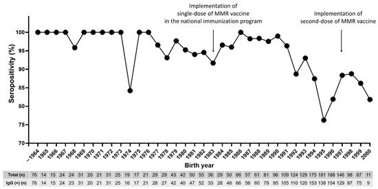 Seroprevalence of measles IgG antibodies according to the year of measles IgG testing.