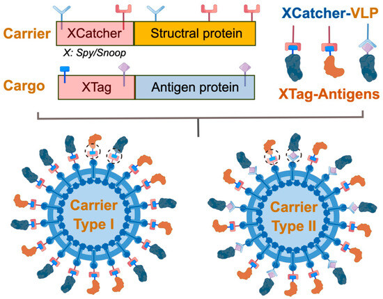Chemical display of the SpyTag/SpyCatcher plug-and-display construction and reaction mechanism. The SpyTag-decorated VLPs with amine group are produced by fusing 13 aa SpyTag sequence with structural protein DNA sequence and are expressed in a chosen vector. Meanwhile, the SpyCatcher (138 aa) is fused with the target antigen and expressed separately in a selected vector. The SpyTag/SpyCatcher can induce spontaneous and robust protein chemistry between Lysine (Lys) and Aspartic acid (Asp) to form a covalent amide bond (dashed circles). Carrier Type I uses homogenic Xtag/XCatcher, while Carrier Type II uses heterogenic Xtag/Xcatcher. The locations of the SpyTag and SpyCatcher are flexible and should be designed and verified in a protein-dependent manner. The intermolecular isopeptide bond is formed by amide bond formation between the SpyTag/SpyCatcher-antigen and VLP, resulting in antigen display on the surface of VLP. X indicates Spy/Snoop. (Figure was created in Figdraw: https://www.figdraw.com, accessed on 7 October 2022).