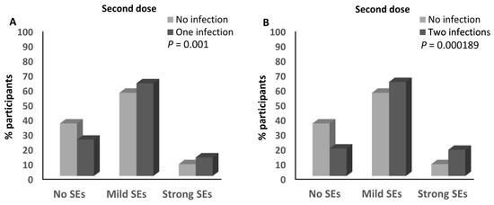 Among the participants, 314 declared that they were infected with SARS-CoV-2 once, 113 declared that they were infected twice, and 401 participants did not report any infection with the virus. The presence of associations between SARS-CoV-2 infection and the magnitude of side effects after receiving an anti-SARS-CoV-2 vaccination was investigated.
