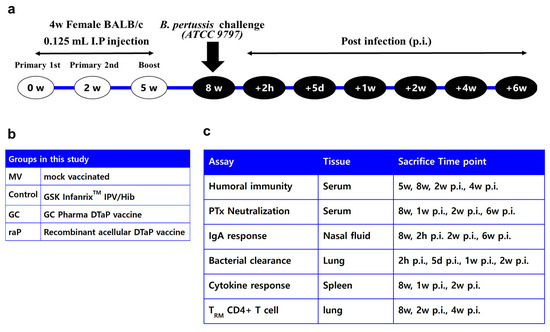 Scheme of the study. Four-week female BABL/c mice were vaccinated according to (a) schedule of the study and (b) groups in this study as shown. All assays performed at each time point indicated in (c) assay lists with 5–8 mice per group.