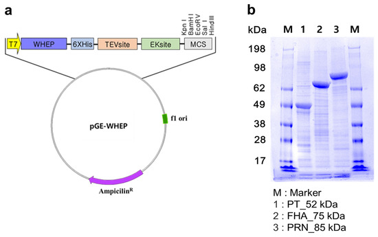 Diagram of WHEP vector and SDS-PAGE results of recombinant pertussis antigens. Recombinant pertussis antigens were produced by (a) WHEP vector. WHEP is a chaperna domain of human origin, derived from glutamyl prolyl tRNA synthetase. Hexa-histidine tag inserted to the vector for Ni-affinity purification. Purified antigens were indicated by (b) SDS-PAGE analysis of raPs. TEV, site-specific TEV protease recognition sequence; EK, site-specific enterokinase recognition sequence; MCS, multi-cloning site.