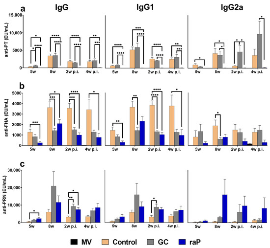 Humoral responses. IgG, IgG1, and IgG2a antibody titers to vaccine antigens (PT NIBSC 15/126, FHA NIBSC JNIH-4, PRN NIBSC 18/154) were determined using ELISA assay. Serum was collected and analyzed at 3 weeks after inoculation with the second primary vaccine (5 weeks), 3 weeks after inoculation with the booster (8 weeks), and at 2 and 4 weeks post-infection with pertussis (ATCC 9797). Data are presented as mean ± standard errors of the mean (SEM) (EU/mL). Results were obtained from eight animals per group at 5 weeks and 8 weeks, and five animals per group post-infection. (a) PT. (b) FHA. (c) PRN. Between-group differences were investigated using one-way ANOVA and Bonferroni’s post hoc test, and p values are visualized as follows: * p < 0.05, ** p < 0.01, *** p < 0.001, **** p < 0.0001. The differences with the mocked-vaccine group are not shown. EU, ELISA unit; MV, mock vaccinated.