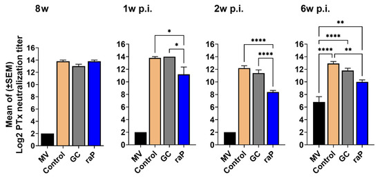 PTx CHO cell neutralization assay. Serum was collected at 3 weeks after the booster injection (8w) and at 1, 2, and 6 weeks post infection (p.i.) with B. pertussis (ATCC 9797), was serially diluted two-fold, then was reacted with NIBSC 15/126 PTx at a concentration corresponding to 4 CPU, and then cultivated with CHO-K1 cells for 24 h. The serum titer was measured as the dilution ratio at which the CHO cell clustering began. All results were transformed to Log2, then expressed as mean ± standard errors of the mean (SEM). Serum was collected from five mice per group. Between-group differences were investigated using one-way ANOVA and Bonferroni’s post hoc test, and p values are displayed as follows: * p < 0.05, ** p < 0.01, **** p < 0.0001. Differences with the mock- vaccinated group only presented at 6 w p.i., since differences of **** p < 0.0001 were observed at 8 w, 1 w p.i., and 2 w p.i. MV, mock vaccinated.