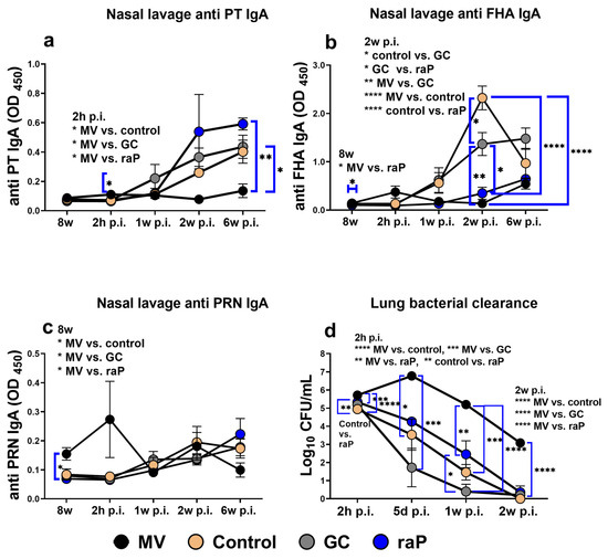 Mucosal IgA plays an important role in intranasal immunity. Specifically, IgA can kill intranasal B. pertussis through opsonization or amplifying the IL-17a expression by TRM cells, contributing to long-term immunity [28,33]. Natural infection or wP vaccination can mainly induce mucosal IgA, but its induction is low in the aP vaccine [28,56]. In accordance with the WHO annex 4, we challenged vaccinated mice intranasally with B. pertussis ATCC 9797 strains. We collected nasal lavage before infection and 2 h and 1, 2, and 6 weeks post infection, and measured the levels of IgA. Vaccination induced a significant increase in the IgA level (most notably raP group) as compared with MV group; although, the IgA level was relatively low for PT or PRN (OD value < 0.6), and there were no between-group differences (Figure 5a,c). FHA-specific IgA was much more pronounced (OD up to ~2) than PT and PRN and showed a steady increase post-infection. The control group showed the strongest response, at 2 weeks post infection, which differed significantly from the raP group (Figure 5b).