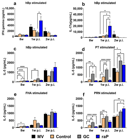 The expression levels of IFN-gamma and IL-17a upon heat-inactivated pertussis (hBp) stimulation were much higher than those upon stimulation with individual single component (compare <1000 units for PT (Figure S3b), FHA (Figure S3c), and PRN (Figure S3d with up to 6000 units for hBp), (Supplementary Materials Figures S3 and S4). IFN-gamma and IL-17a are mainly expressed through natural infection or wP vaccination, but poorly expressed by aP vaccination [27,28,63], and long term protection from the wP vaccination could be explained with it.Assuming that stimulation with heat hBp mimics the response to natural infection [44], the highest responses of IFN-gamma and IL-17a to hBp stimulation are consistent with the results of a previous study conducted in our laboratory [44]. Consistently, 2 weeks post-infection, the mock-vaccinated group showed equal or superior results to other groups, in terms of IFN-gamma and IL-17a (Figure 6a,b, Supplementary Materials Figures S3 and S4). Most notably, the raP group, among all groups tested, including the commercial control group, showed the highest-level stimulation for both IFN-gamma and IL-17a at 1 week post-infection. Unlike IFN-gamma and IL-17a, IL-5 showed similar expression levels in response to hBp and each of the three antigens; although, the expression level was variable among individual components (PT, FHA and PRN) before and after challenge (Figure 6c–f). The distinctive stimulation of IFN-gamma and IL-17a may contribute to the sterile protection offered by the raP vaccine (Figure 5d).
