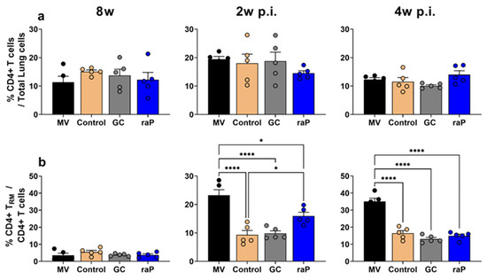 Expression of CD4+ T cells and CD4+ TRM cells. CD4+ T cells and T RM cells in lungs from five mice per each group were analyzed with FACS Aria Fusion at 8 weeks and 2 weeks post-infection (p.i.) and 4 weeks p.i. (a) Accumulation of CD4+ T cells among 10,000 lung cells are shown as a percentage. (b) The graph shows the percentage of CD4+ T RM cells among total CD4+ T cells in lung tissue-resident cells (CD3+ CD45.2+ CD4+). All groups were compared using one-way ANOVA and Bonferroni’s post hoc test. p values are as follows: * p < 0.05, **** p < 0.0001.