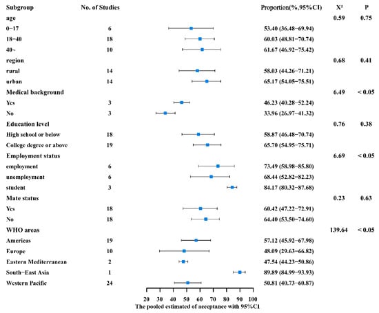 According to the subgroup analysis of different characteristics and behavioral habits, the vaccination acceptance rate of people with a medical background (46.23%, 95% CI: 40.28–52.24%) was significantly higher than that of those without a medical background (33.96%, 95% CI: 26.97–41.32%) (p = 0.01). In comparison to the employed population (66.93%, 95% CI: 48.79–82.81%) and the unemployed (68.44%, 95% CI: 52.82–82.23%), vaccination acceptance rates were lower among students (47.35%, 95% CI: 37.00–57.81%) (p = 0.04). The Americas region (57.12%, 95%CI: 45.92–67.98%) and South-East Asia region (89.89%, 95%CI: 84.99–93.93%) had higher acceptance rates than the Western Pacific region (50.81%, 95%CI: 40.73–60.87%), the European region (48.09%, 95%CI: 29.63–66.82%), and the Eastern Mediterranean region (47.54%, 95%CI: 44.23–50.86%). Table S4 shows the sample size of studies and combined acceptance rates for countries in the different WHO regions. Furthermore, between different ages (0–17 [53.40%] vs. 18–40 [60.03%] vs. 40~ [61.67%]), areas of residence (rural 58.03% vs. urban 65.17%), educational backgrounds (high school and below 58.87% vs. college and above 65.70%), and partner statuses (yes 60.42% vs. no 64.40%), there was no statistical difference (p > 0.05) (Figure 3).