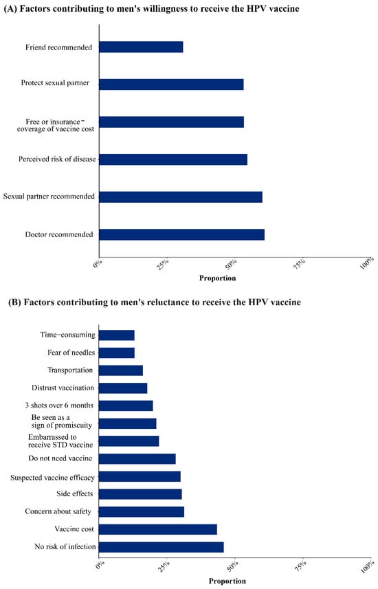 The most significant barriers to vaccination were perceived low infection risk (45.91%, 95% CI: 31.73–60.43%) and vaccine cost (43.46%, 95% CI: 31.20–56.13%). Concerns about the vaccine’s safety (31.37%, 95% CI: 16.99–47.82%) and effectiveness (30.06%, 95% CI: 18.42–43.15%) and fear of unfavorable side effects (30.52%, 95% CI: 17.02–45.97%) were also significant deterrents among men. In addition, the belief that they do not need the vaccine (28.23%), embarrassment because the HPV vaccine is a preventive against sexually transmitted diseases (22.13%), belief that the HPV vaccine causes sexual promiscuity (21.17%), the need to complete three doses within six months (19.94%), distrust of the vaccine (17.84%), fear of needles (13.17%), transportation (16.24%), and time expenses (13.10%) were also reasons for refusal of vaccination (Figure 5B).
