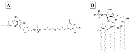Structures of INI-4001 (A), a lipidated oxoadenine and a TLR 7/8 agonist, and INI-2002 (B), a synthetic TLR 4 agonist.