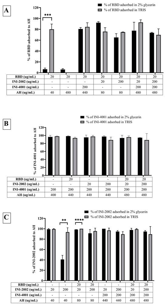Adsorption efficiencies of (A) RBD, (B) INI-4001, and (C) INI-2002 to AH. RDB did not adsorb to AH in 2% glycerin. The usage of TRIS buffer at pH 8.1 significantly improved the adsorption efficiency of RBD to AH. INI-4001 and INI-2002 adsorbed to AH in both 2% glycerin and TRIS buffer. A one-way ANOVA with a post hoc Tukey’s test was used to compare between groups. Asterisks indicate statistical differences between relevant groups; ** = p < 0.01, *** = p < 0.001, **** = p < 0.0001.