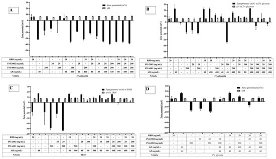 Zeta potential and pH of mixtures of RBD, INI-4001, and INI-2002 with (A) AP, (B) AH in 2% glycerin as formulation vehicle, (C) AH in TRIS buffer as the formulation vehicle, and (D) Combination of AH and AP.