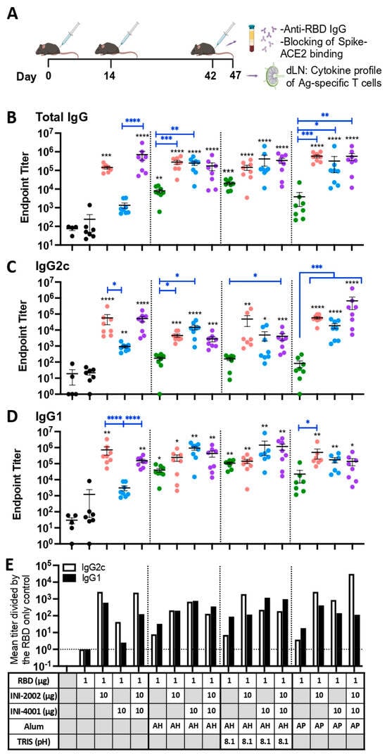 RBD-specific serum IgG antibody titers. (A) Schematic of the experimental timeline (created with BioRender.com). (B–D) Titer of RBD-binding antibodies in serum from 28 days after 2nd vaccination. (B) IgG (C) IgG2c isotype (D) IgG1 isotype. (E) relative fold change in the mean titer of RBD-specific IgG2c (open) or IgG1 (filled) over the mean titer of the RBD alone group. Black lines indicate the mean and standard error of the mean for each group, while individual mice are represented by symbols. Black asterisks designate significant differences (by one-way ANOVA) compared with the RBD antigen-only group (solid black circles). Symbols for formulations containing only alum are green, those with INI-2002 are red, INI-4001 blue, and both together are purple. Blue lines and asterisks specify significant differences among groups receiving the same type of formulation. * = p < 0.05, ** = p < 0.01, *** = p < 0.001, **** = p < 0.0001.