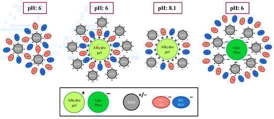Alternately, RBD efficiently adsorbed to AH without TRIS buffer when the AH was pre-adsorbed to INI-4001 and/or INI-2002, improving from 6.5% to more than 65% (Figure 2A). With the addition of RBD, the zeta potential of the AH formulation with INI-4001 changed from +11 mV to +15 mV (Figure 3B), suggestive of adsorption of RBD to AH. The adsorption of anionic ligands on the surface of the cationic AH could provide negatively charged areas to facilitate the subsequent adsorption of RBD. Thus, the combination of INI-4001 and/or INI-2002, along with RBD, can be adsorbed in the correct order of addition and co-delivered with AH, even at pH 6.