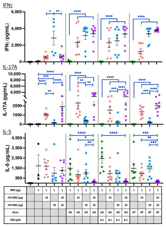 Cytokine release from RBD-specific T cells upon restimulation. Cytokine concentrations in supernatants recovered from a 72 h culture of ex vivo dLN cell suspensions stimulated with 10 µg/mL RBD protein. Five days after a third vaccination, cells were recovered and cultured to assess the phenotype of RBD-specific T cells. Black lines indicate the mean and standard error of the mean for each group, while individual mice are represented by symbols. Symbols for formulations containing only alum are green, those with INI-2002 are red, INI-4001 blue, and both together are purple. Black asterisks designate significant differences compared with the RBD antigen-only group (black). Blue lines and asterisks specify significant differences among groups receiving the same type of formulation (aqueous or alum type) * = p < 0.05, ** = p < 0.01, *** = p < 0.001, **** = p < 0.0001.