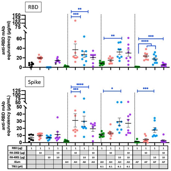Pre-formulation studies were performed to optimize the amount of aluminum salt (AH or AP) needed to fully adsorb INI-4001, INI-2002, or RBD, as well as the duration of mixing required to achieve complete adsorption. The results indicated efficient adsorption of INI-4001, INI-2002, or RBD to aluminum salt at a 1:2 weight ratio (Figure S1). Hence, this weight ratio was used for all the subsequent formulation studies reported herein. Although complete adsorption was achieved in 30 min, the duration of mixing was increased to 60 min to ensure complete adsorption.