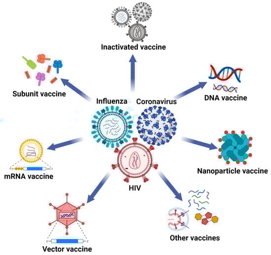Different types of antiviral vaccines. Many different kinds of vaccines have been developed to combat influenza viruses, coronaviruses, and HIV, which include inactivated vaccines, DNA vaccines, mRNA vaccines, protein subunit vaccines, viral vector-based vaccines, nanoparticle vaccines, and many other types.