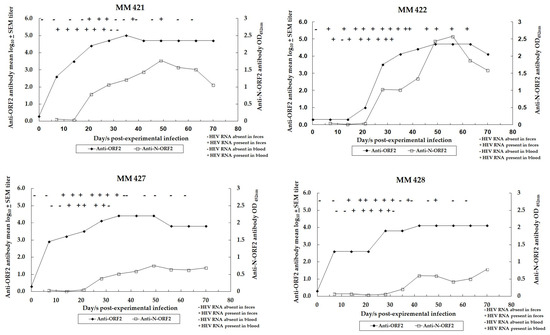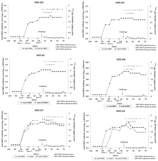 Figure 3 depicts the dynamics of HEV infection in control and unimmunized monkeys (MM 421, 422, 427, and 428) experimentally infected with challenge inoculums of the virus (106 HEV RNA copies, 10,000 MID50 HEV).